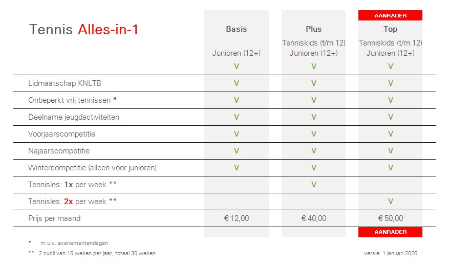 Tennis Alles-in-1 is een abonnementsvorm met in ieder geval het lidmaatschap, competitie én het meedoen aan clubevenementen. Ook zijn er pakketten waar de tennisles bij in zit. In deze video van de KNLTB wordt Tennis Alles-in 1 uitgelegd en op deze pagina vind je uitgebreide informatie over Tennis Alles-in-1.