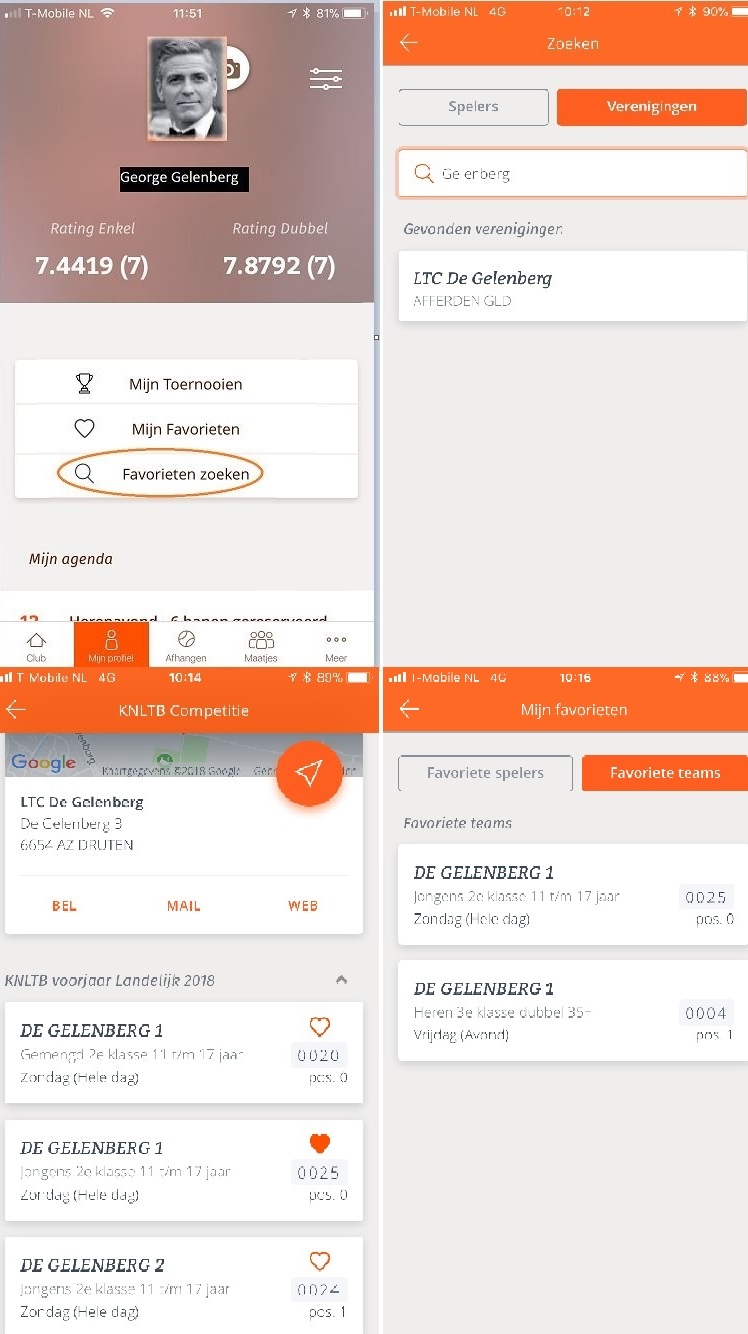 Onder de menuknop 'Mijn profiel' en vervolgens ‘favorieten zoeken' (afbeelding 1) selecteer je de betreffende competitie (afbeelding 2).